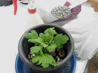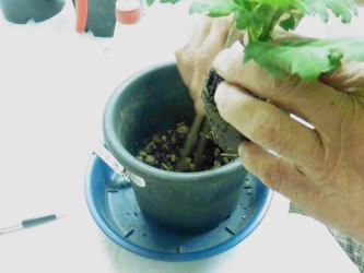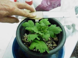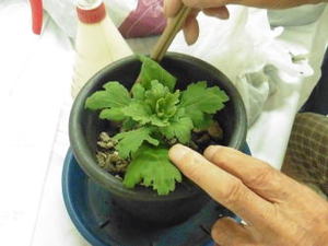 挿し芽の発根が不十分な福助苗は、ポットの定植時期に、5号鉢へ直接定植する。