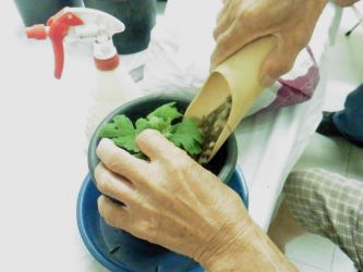 05.培養土の上に元肥を大匙2杯加え、又水も加え上面の培養土と良く混ぜ,肥料と培養土を良く馴染ませる