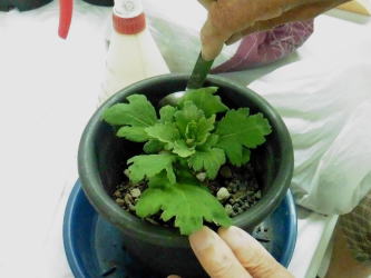 挿し芽床の福助菊の苗を直接5号菊鉢へ定植する手順(下の断面図参照)