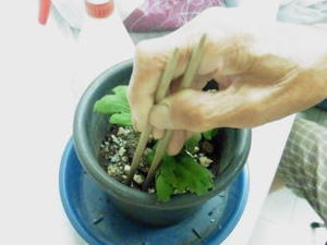 - 鉢の内部の培養土を箸で突き、ポットを安定させる