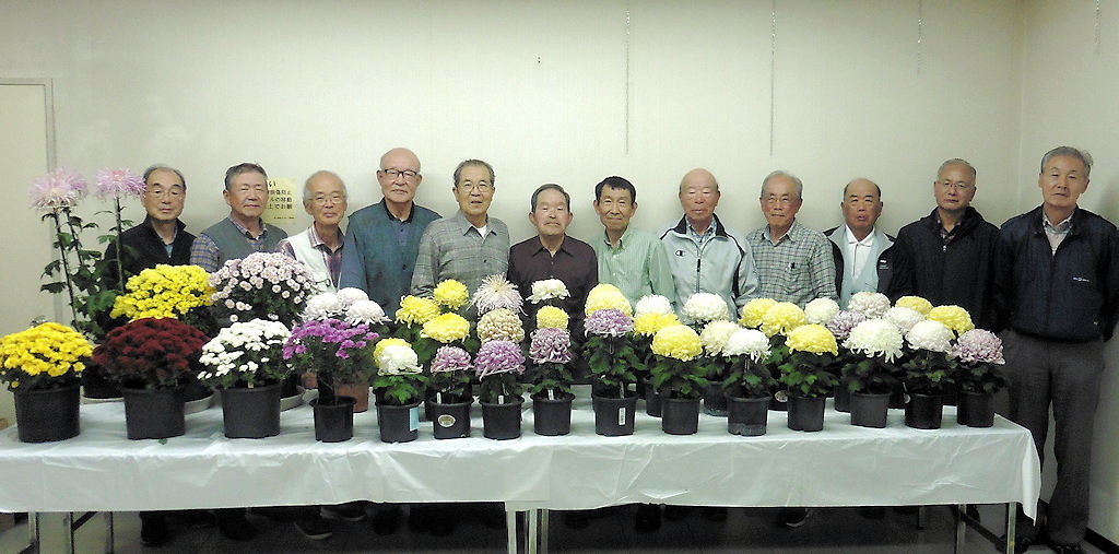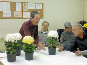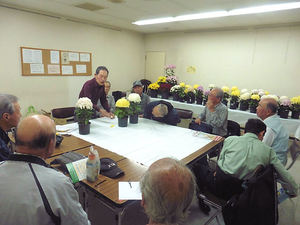 ①各自が育成した福助菊、ドーム菊、ざる菊、他三本立て等を持参し、展示し評価し合い、次年度に活かす。