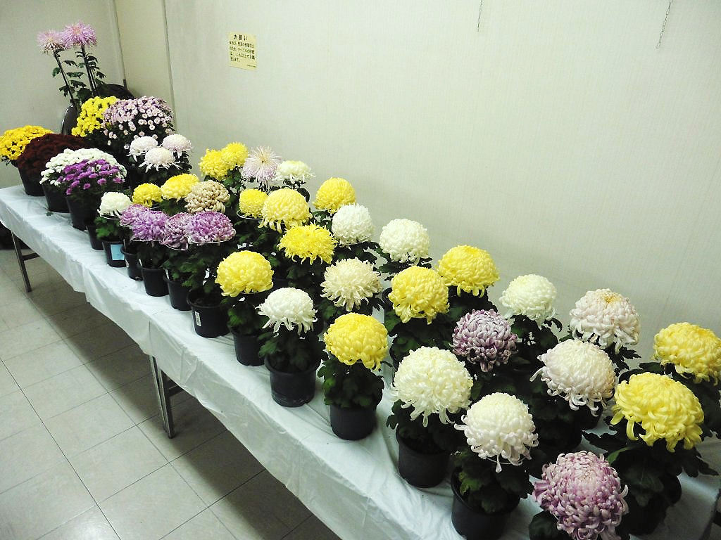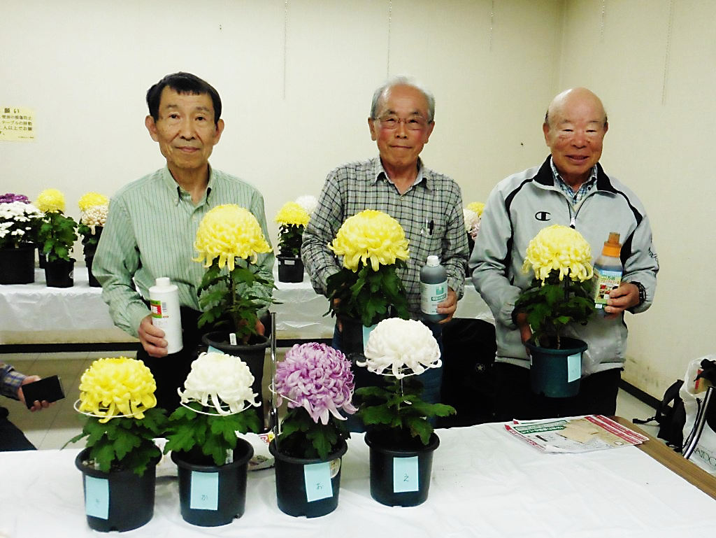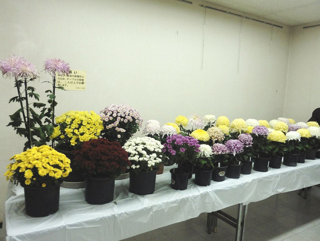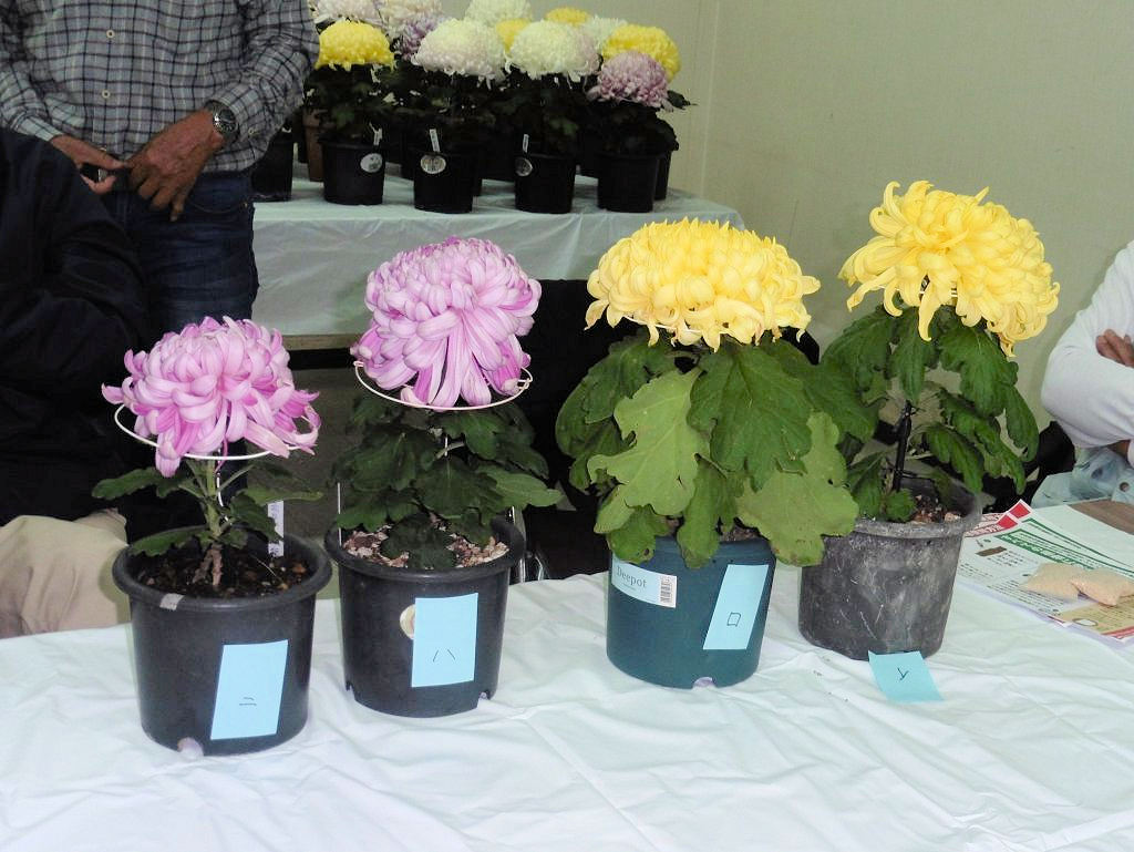 ①各自が育成した福助菊、ドーム菊、ざる菊、他三本立て等を持参し、展示し評価し合い、次年度に活かす。
