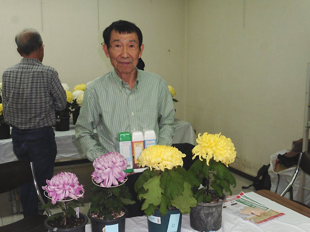 ③福助菊の表彰 皆さんの投票により最優秀賞1点だけを決めた。石坂さんの「国華徳望」が選ばれた。