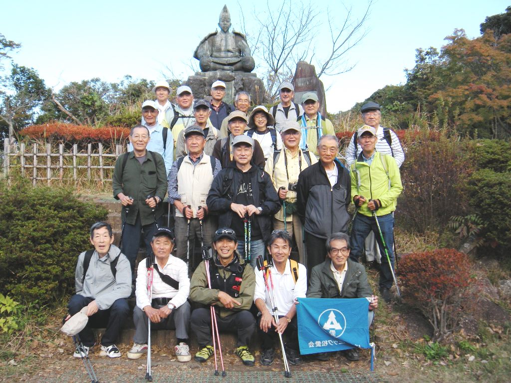 ポールストレッチ体操でほぐし、 源頼朝像へ移動して記念の集合写真を撮影しました。