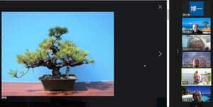 ② 先ず「展示館」コーナーでは「写真館」と「趣味の作品館」あって、「写真館」は松愛フォトクラブの会員が毎月のように投稿している状況と一部の作品の解説を戴いた。次に「趣味の作品館」は水彩画・ハガキ絵・盆栽・陶芸等が展示されている事。その後、「盆栽の画像」を展示している荒武さんから、岳父より引き継いだ盆栽の世話の仕方の他、楽しみや苦労話などをお聴きしました。「陶芸の画像」を展示されたのは南野さんですが、井川さんより陶芸を写した背景や角度などについても見事だとの解説がありました。