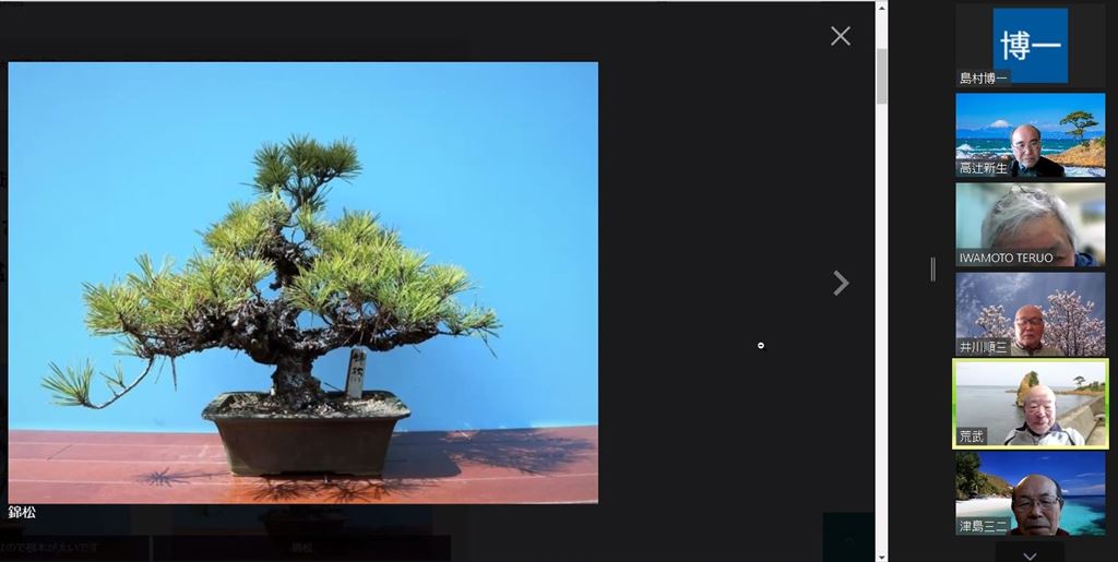 ② 先ず「展示館」コーナーでは「写真館」と「趣味の作品館」あって、「写真館」は松愛フォトクラブの会員が毎月のように投稿している状況と一部の作品の解説を戴いた。次に「趣味の作品館」は水彩画・ハガキ絵・盆栽・陶芸等が展示されている事。その後、「盆栽の画像」を展示している荒武さんから、岳父より引き継いだ盆栽の世話の仕方の他、楽しみや苦労話などをお聴きしました。「陶芸の画像」を展示されたのは南野さんですが、井川さんより陶芸を写した背景や角度などについても見事だとの解説がありました。