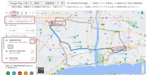 ①、今回は、資料の後半の便利機能としての「経路検索」や「地点間距離の測定」を行う;「経路検索」では移動方法の設定を「自動車・公共交通機関・徒歩・自転車・航空機」の中から1つを選択し、「出発地」と「目的地」を入力します。電車やバスなどの「公共交通機関」を利用する場合は「直ぐに出発」の他に、「日時の指定」も対応出来ます。検索結果は下方に、数種類の経路が提示されるので良く比べて最適な経路を選びましょう。尚、その時「総距離・総時間」の他、「詳細」欄を開くと詳しい経路説明や費用等も表示されます。説明後は各自演習を行って使い方の理解に努めた。