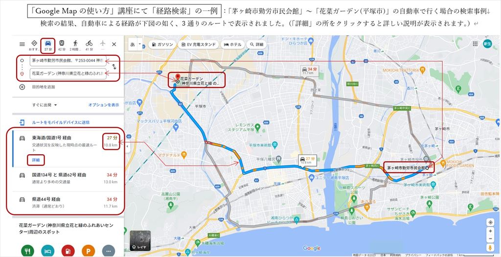 ①、今回は、資料の後半の便利機能としての「経路検索」や「地点間距離の測定」を行う;「経路検索」では移動方法の設定を「自動車・公共交通機関・徒歩・自転車・航空機」の中から1つを選択し、「出発地」と「目的地」を入力します。電車やバスなどの「公共交通機関」を利用する場合は「直ぐに出発」の他に、「日時の指定」も対応出来ます。検索結果は下方に、数種類の経路が提示されるので良く比べて最適な経路を選びましょう。尚、その時「総距離・総時間」の他、「詳細」欄を開くと詳しい経路説明や費用等も表示されます。説明後は各自演習を行って使い方の理解に努めた。