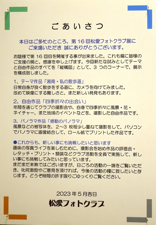 松愛フォトクラブの最大のイベントである「第16回松愛フォトクラブ展」を開催しました。 フォトクラブの活動の集大成ともいえるこの展示会は、5月9日~5月14日の6日間にわたり、藤沢市民ギャラリーにて開催しました。