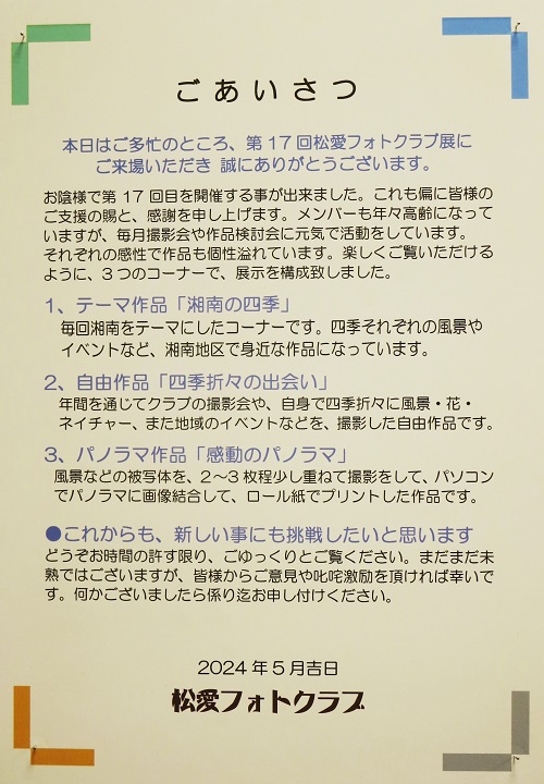 松愛フォトクラブの最大のイベントである「第17回松愛フォトクラブ展」を開催しました。 フォトクラブの活動の集大成ともいえるこの展示会は、5月14日~5月19日の6日間にわたり、藤沢市民ギャラリーにて開催しました。