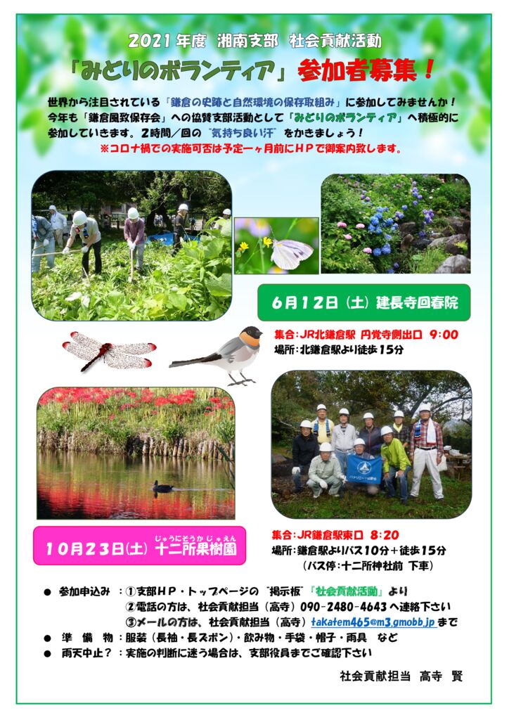 「鎌倉風致保存会」”みどりのボランティア”活動に参加 ・6/12(土) 建長寺回春院 ・10/23(土) 十二所果樹園 |