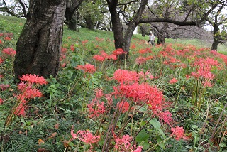 その後、吉見町のさくら堤公園に移動し堤体の斜面に咲く彼岸花と田園風景を撮影しました。