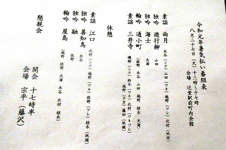 恒例行事としての歌仙会は横浜・湘南支部の謡曲愛好者の集いで、今回は暑気払いを兼ねての開催でした。