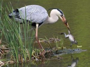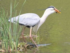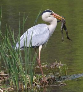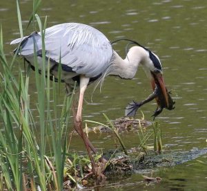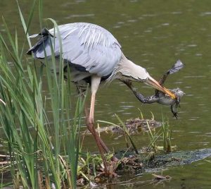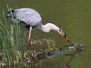 - アオサギが大きなカエルを見つけました。 ウシガエルかな?