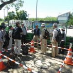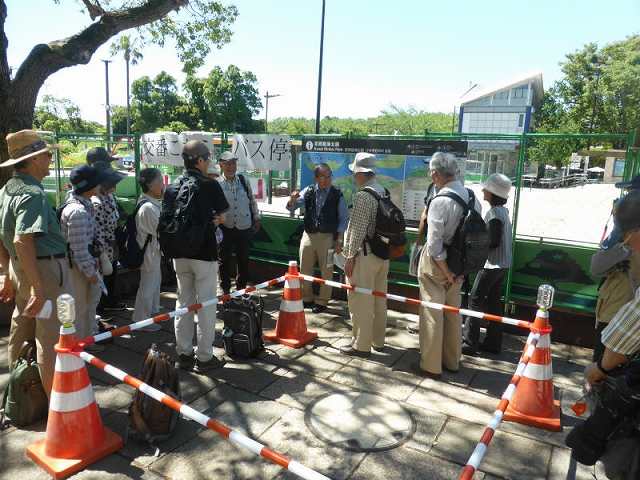 - 駅前の「公園案内図」を前にして本日のルート解説
