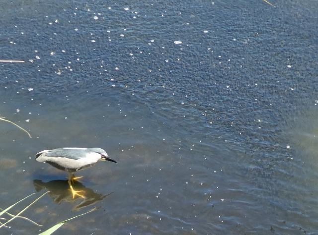 - ゴイサギ、小魚(ボラかな)の群れに向かっています