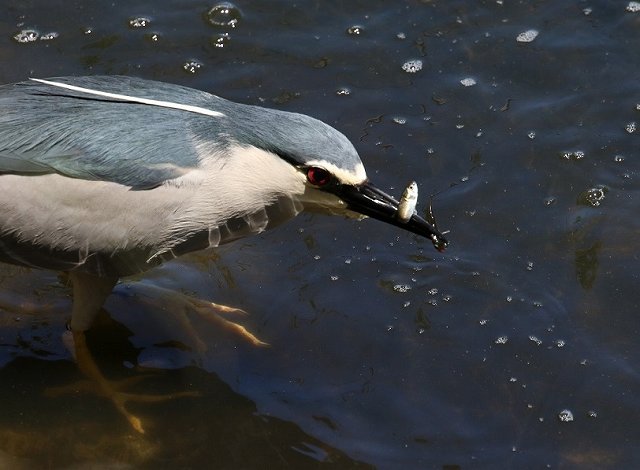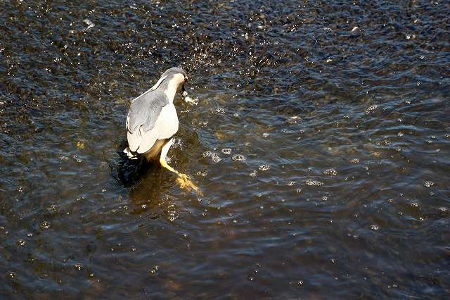 - ゴイサギ、勢いよく魚の群れに跳びかかりました