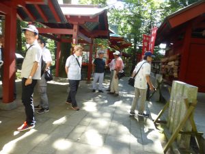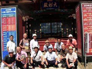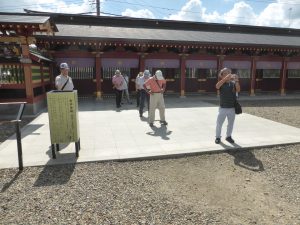 - 拝殿をバックに記念写真、撮影者は巫女さんです