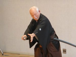 小倉先生が、羽織袴姿で真剣を手に居合いの妙技を披露された。