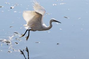 - コサギは優雅に飛びます、黄色い足先と黒いくちばし