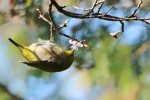 - メジロ、盛んに花の蜜を吸いに回遊中