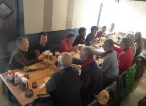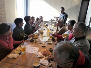 - 川崎駅前までバス移動、高層ビル内の居酒屋で懇親会