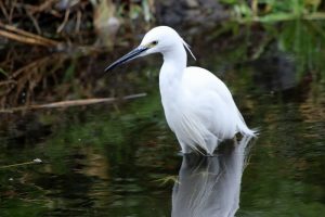 - コサギ、頭部の冠羽・黄色い足先が特徴です