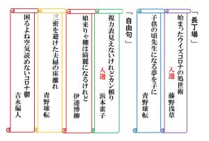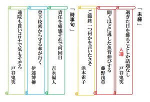 句 会 新型コロナウィルス対策で、各自宅にてインターネットを介して、投句・互選・点盛り・評価・提案等を続け、ホームページ掲載句、入選句を決定した。