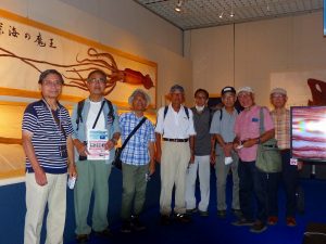 - イオウイカのカラー魚拓をバックに、来場記念に8名の顔ぶれ