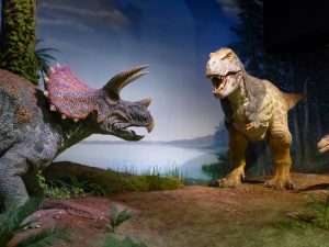 - 恐竜時代、ティラノサウルス親子とトリケラトプスの戦いを再現