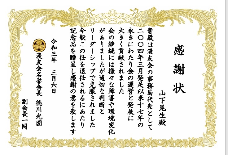 昼食後に2004年3月漫友会発足時から17年間事務局代表として貢献頂いた