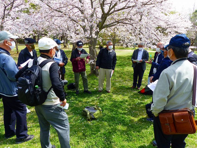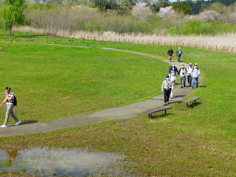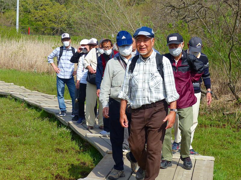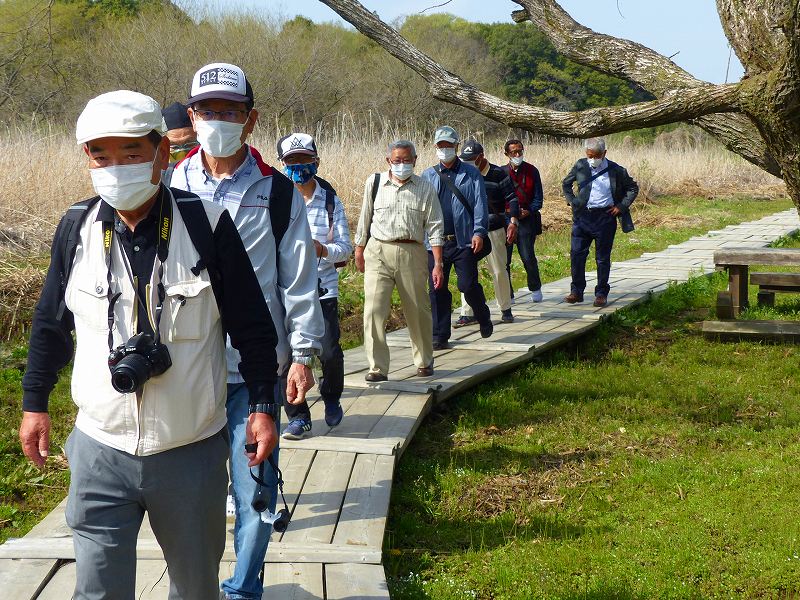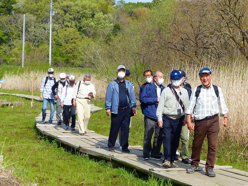 終日屋外での行動で、天候にも恵まれ、このコロナ禍の中で健康的な一日を過ごせたと思います。桜の杜公園では昼食前のミーティングで今回から漫友会に参加の三瓶健治さんに自己紹介を頂き、12月から参加の吉田英義さんにも改めてご挨拶を頂きました。また、来月からの予定についても実施内容が確定している幹事さんからその詳細の説明を頂き、6月にはそれに合わせて実施する地区大会の確認も行いました。今回は「東京野鳥観察会」の戸谷さんに野鳥の道でのガイドをお願いしましたが、湿地草原の「木の道」(当初計画はこの部分のみ)に静かな林間の「土の道」を加えようとのご提案があり、城址公園と野鳥の道散策の順番を入れ替え、行程を拡充し、解散場所も守谷駅から南守谷駅に変更しました。
