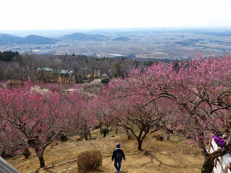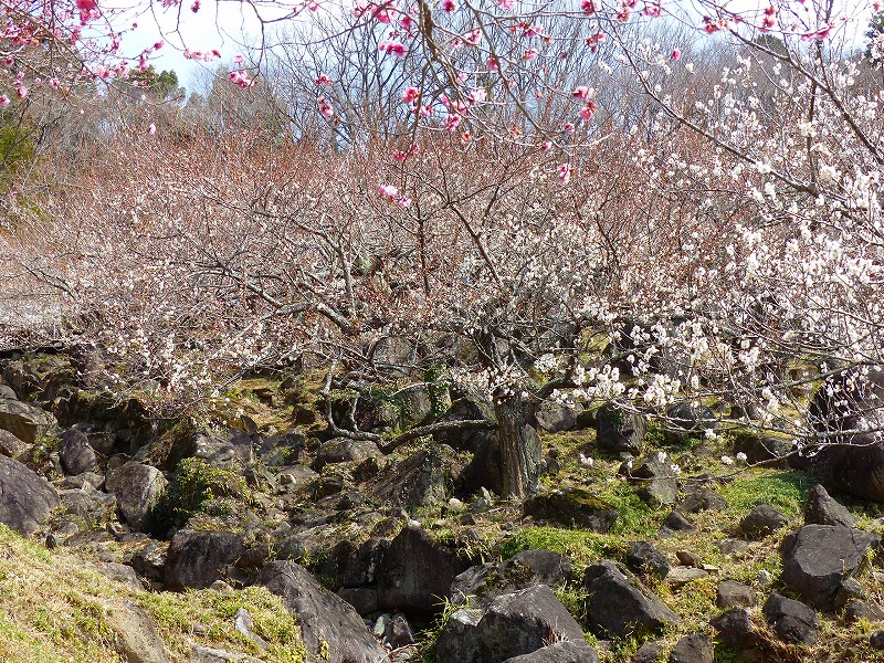| 筑波山の中腹(標高250m)の斜面に広がる(4.5ha)梅林です。早咲きから遅咲きまでの約1,000本の白梅と紅梅が有り、2月中旬から3月中旬まで楽しむことが出来ます。筑波山ではお馴染みの斑レイ岩の巨石と梅との独特なコントラストも見ごたえが有ります。 | ||