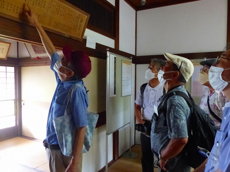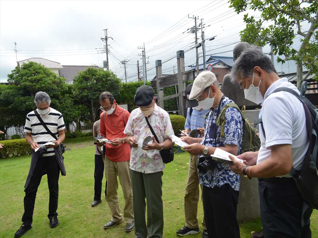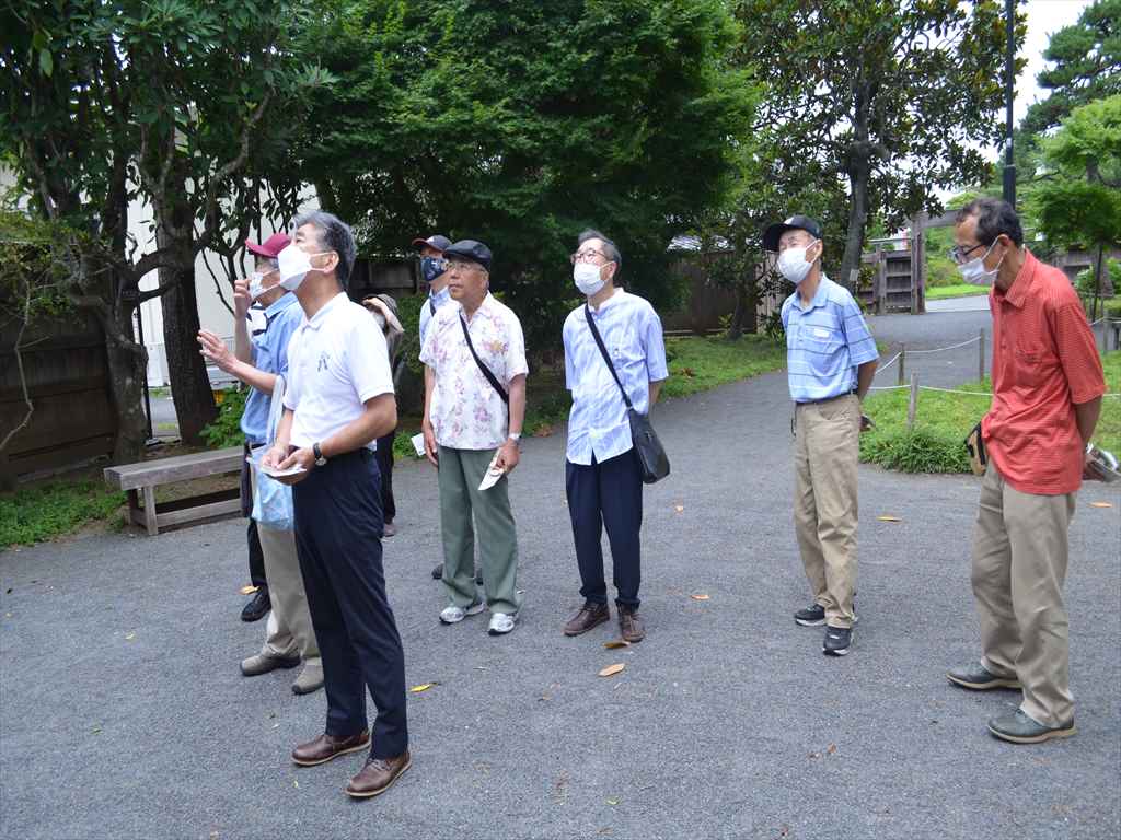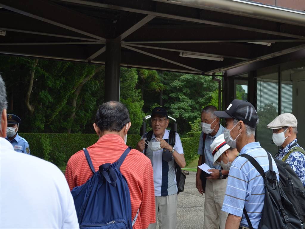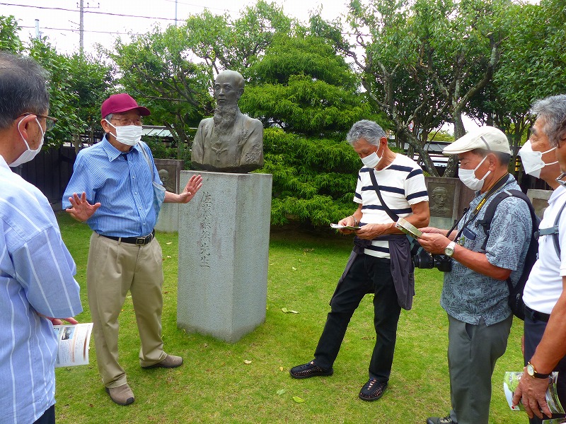 - 創始者佐藤泰然像の前でガイドの話を聞く