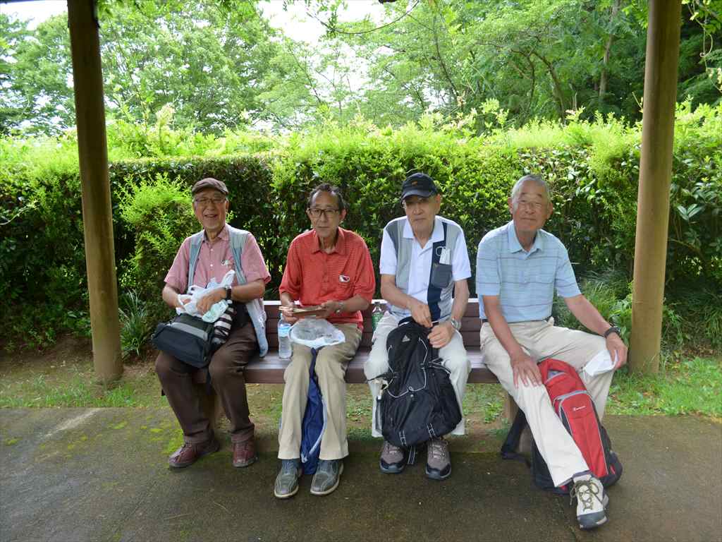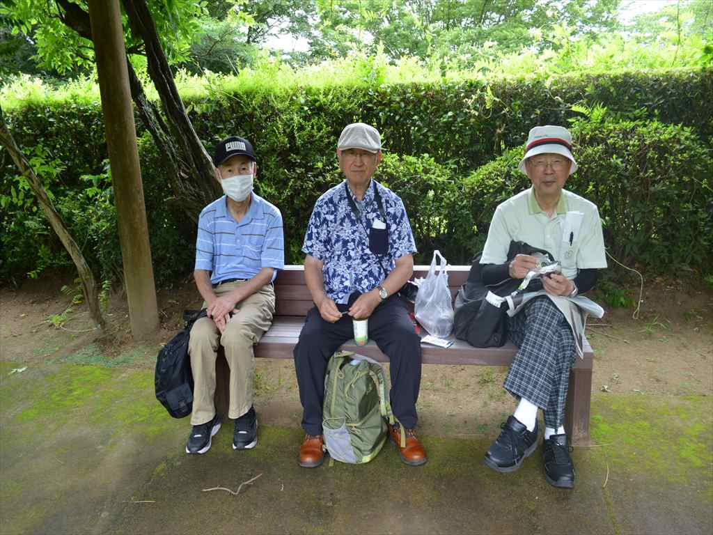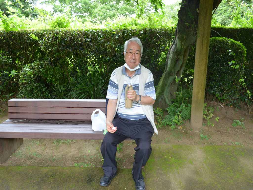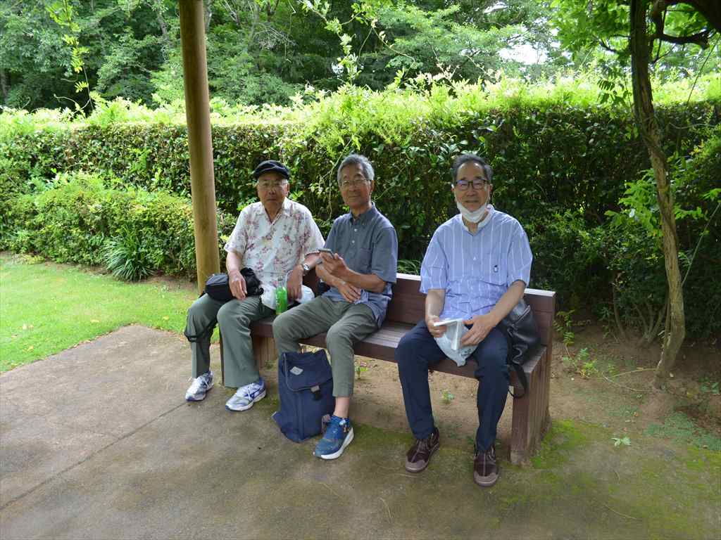 - 庭園のベンチでそれぞれ持参の弁当昼食