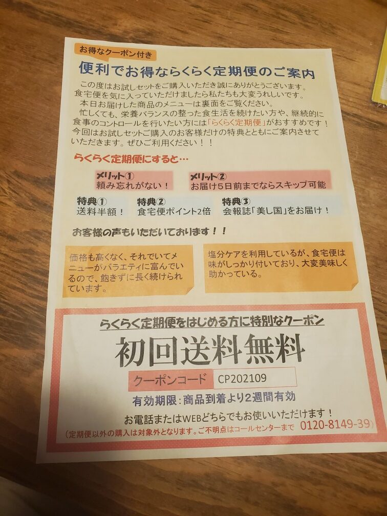 テレビCMでワタミの宅食や新聞折込が多数あると逆に不安になる昨今、パナソニック共済会の仲介がありますと安心して注文ができると考えました。支部役員時代の友愛活動を思い出しますと、奥様の自宅介護をしながら食事を毎回作られているかつての職場の大先輩の苦労談もお聞きしました。松愛会のニーズは高いのではないかと感じ今月の支部長メッセージにて紹介させていただきます。残念ながらパナソニック共済会の定年退職者向けHP見ても食宅便に触れられていないのでお試しセットに同封されていたカタログのURLを紹介します。また添付の実物写真も参考になれば幸いでございます。