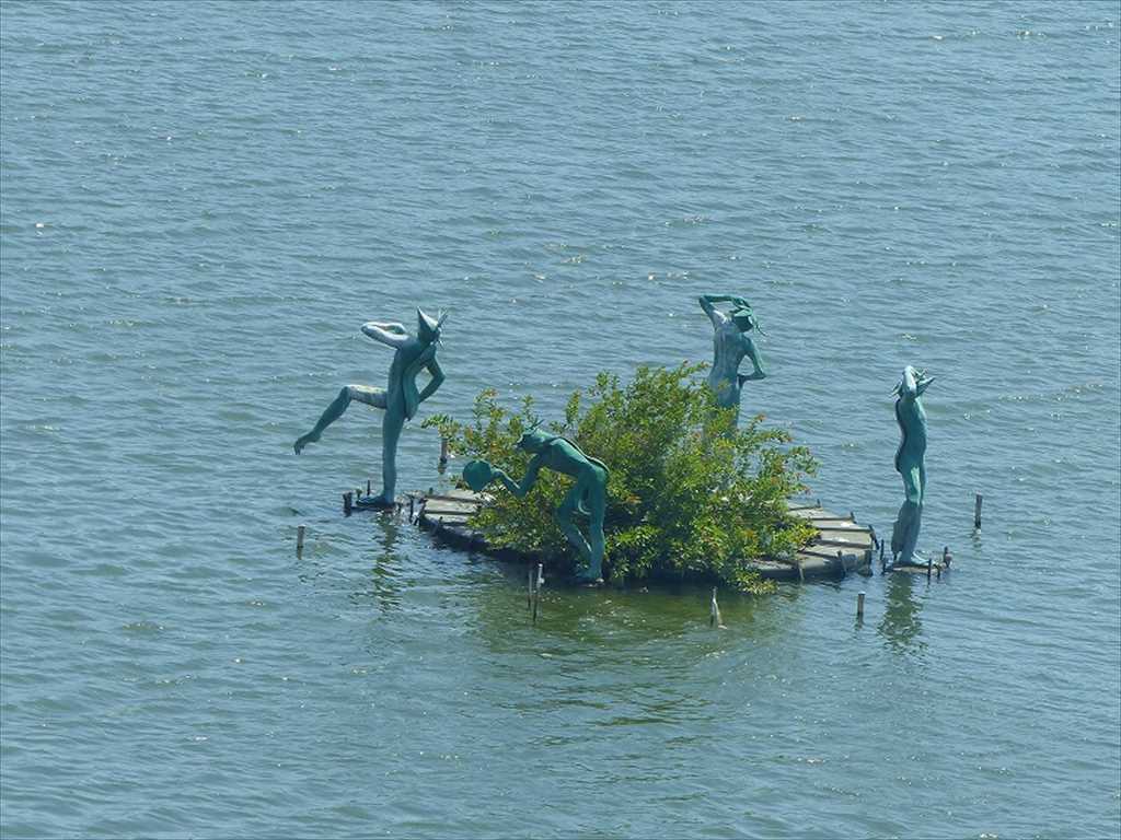 - 同じく眼下に見る湖畔を飾る「かっぱ」モニュメント