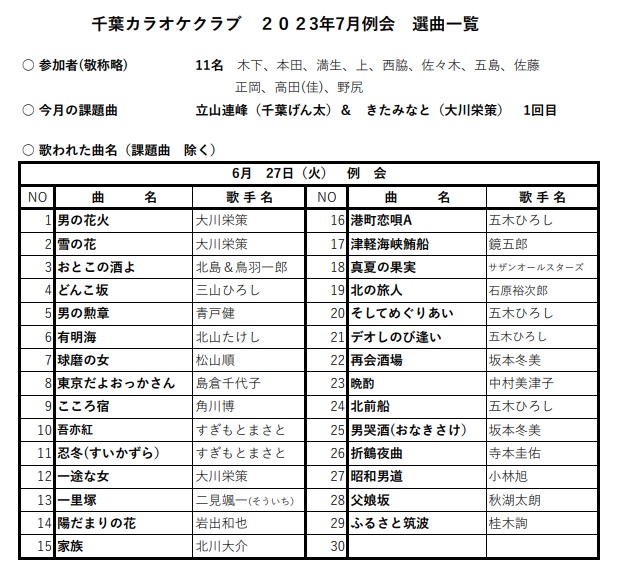 参加者は11名、歌われた曲は一覧表に記載しています。