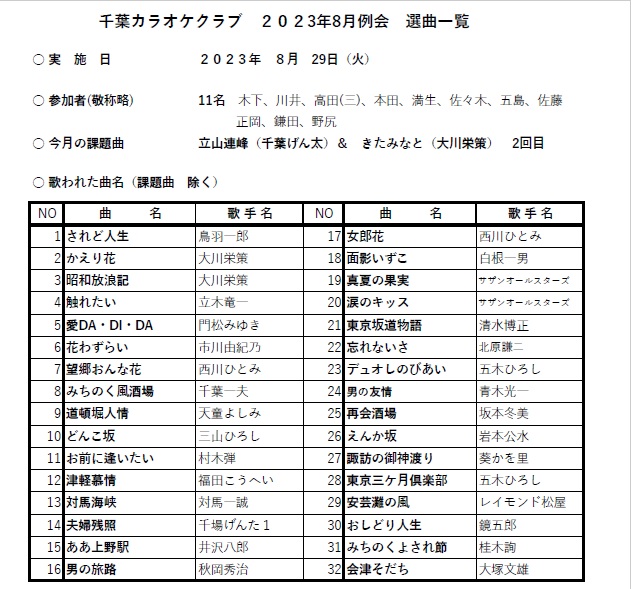 千葉カラオケクラブ 令和5年8月例会は、8月29日(火)“まねきねこ津田沼北口2号店” で開催しました。残暑厳しい中でありましたが、涼しい会場で皆さん元気に声を出し、練習の成果を充分に発揮されました。参加者は11名、歌われた曲は一覧表に記載しています。
