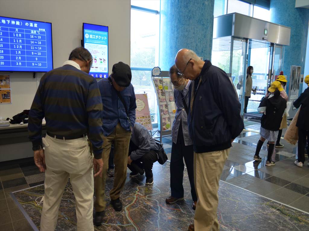 - バスで見学拠点の「龍Q館」到着、お出迎えのパネル地図に見入る