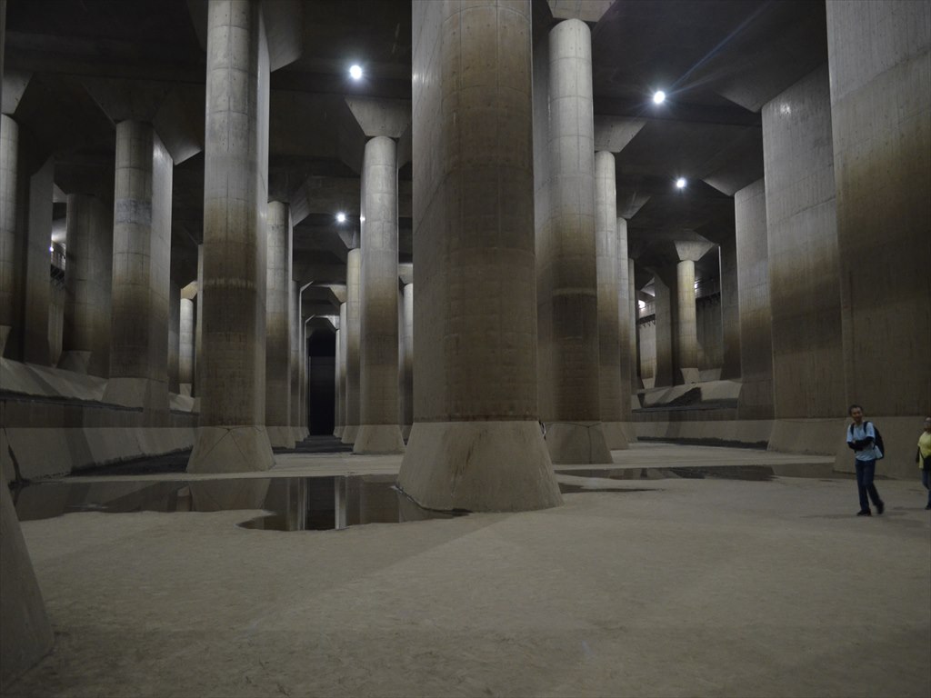 埼玉県の中川・綾瀬川流域は、利根川、江戸川、荒川といった大河川に囲まれたお皿のような低い地形で、また、河川の勾配が非常に緩やかなため水が流れ難い等、昔より浸水被害に絶えず悩まされた来ました。洪水被害を軽減することを目的に、春日部市にある中小5河川の洪水を江戸川に排水する世界最大級の地下水路「首都圏外郭放水路」が誕生しました。