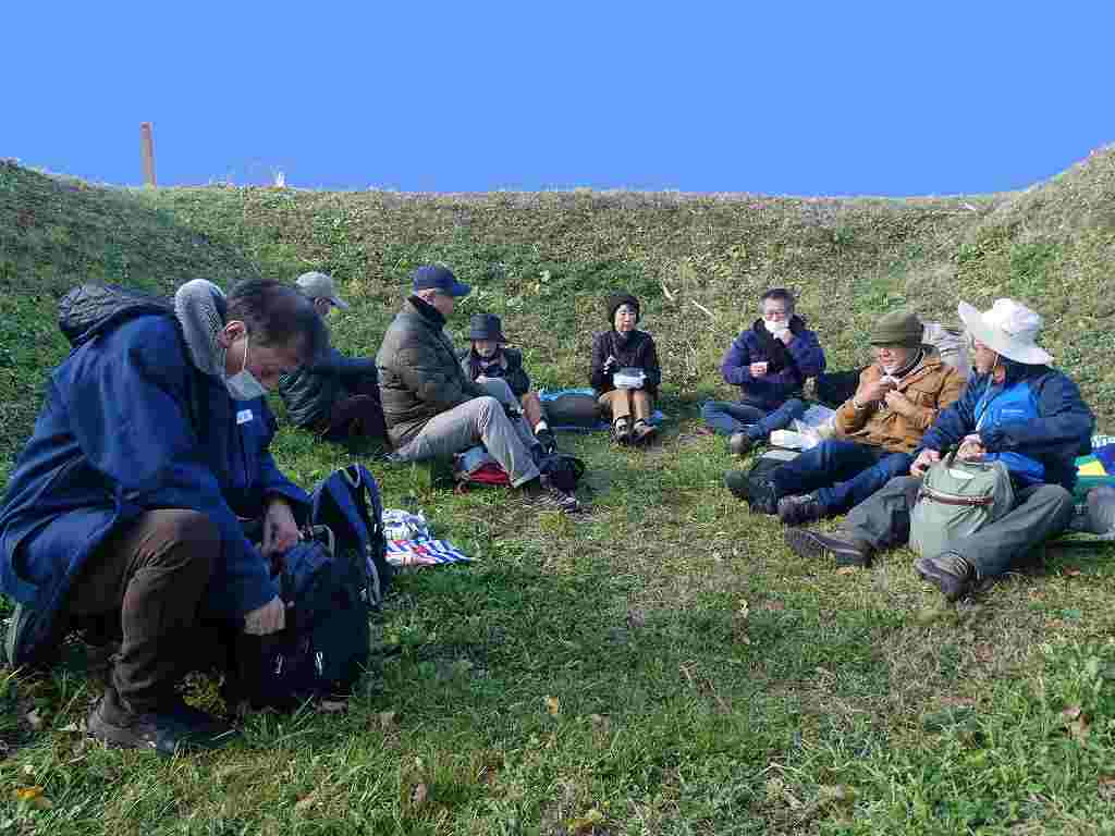 - 風邪を避けて窪地で昼食