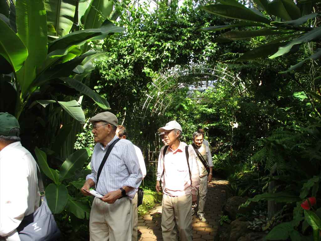 シンボルツリーのタビビトノキ、コーヒーノキ、ヒスイカズラなど熱帯植物の大温室です。