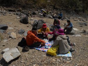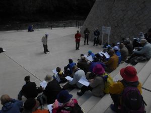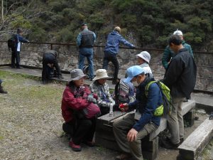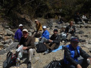 武庫川沿いに大迫力の切り立った岩山、奇岩、急流、自然が創った壮大な大自然を満喫しながら進むと、昼食場所の名所「桜の園」到着。昼食と懇談。