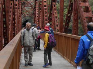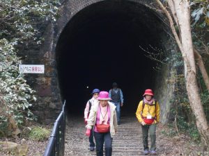 公園から武庫川までは下り道、「水道橋」を渡ると、いよいよ旧福知山廃線跡。生瀬と武田尾間の廃線跡は、風光明媚な武庫川渓流。奇岩と深い渓谷美、暗いトンネルは懐中電灯で足元を照らし枕木、砂利を踏みしめて歩き、暗闇の中でも楽しい会話が弾みました。