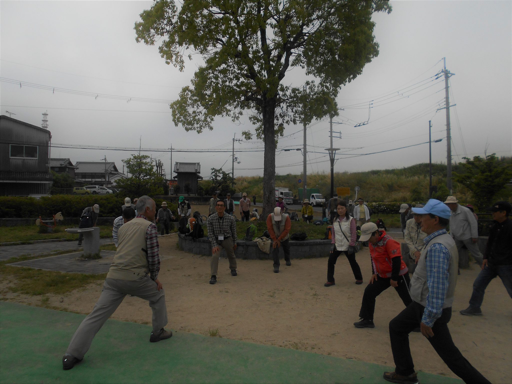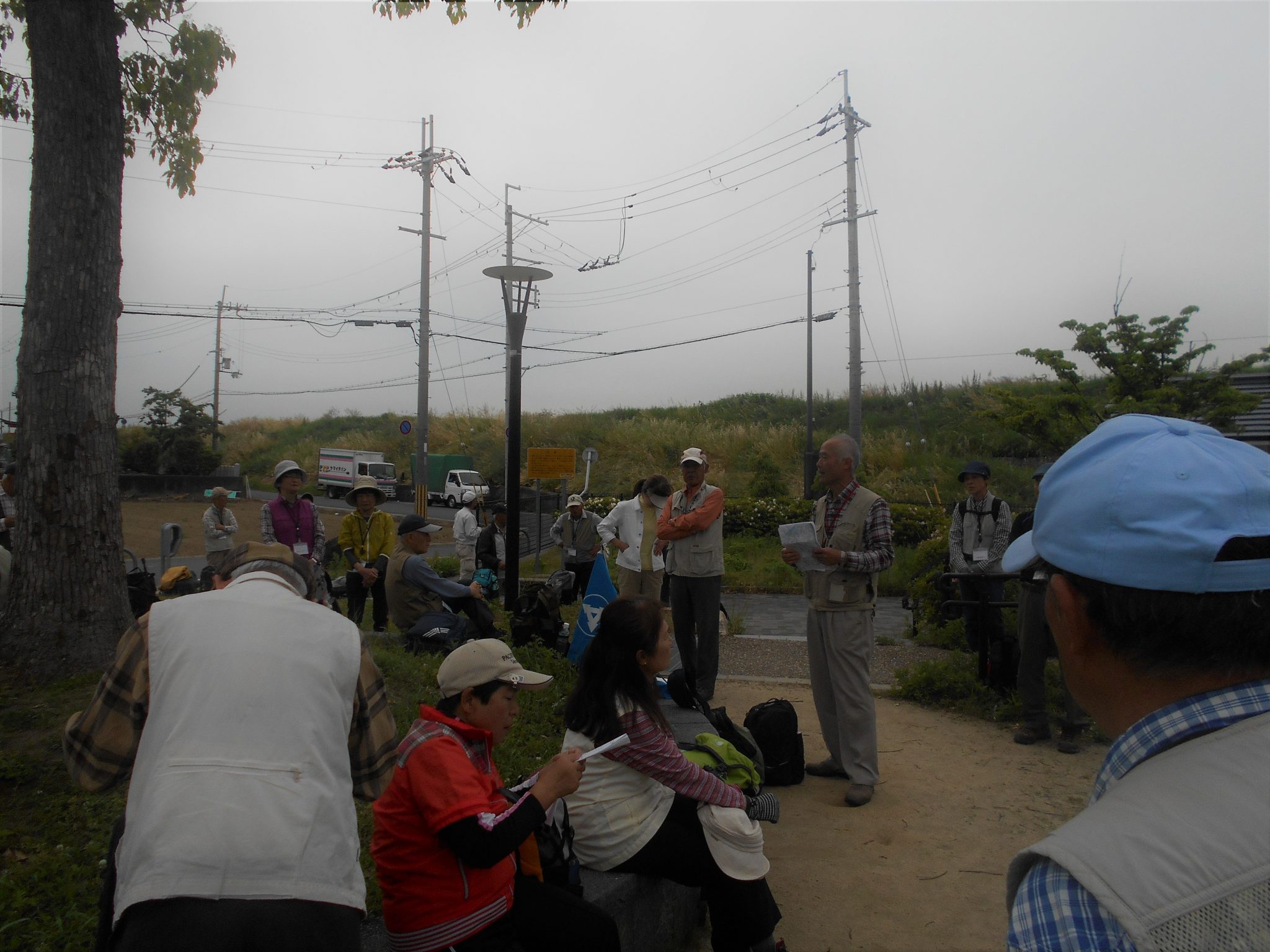 桂川駅前は、出勤の皆様に迷惑が掛かる為、上久世橋、桂川歩道橋を通り30分程度移動して河川敷の側にあるかさい公園で担当幹事から行程の説明があった。 京都水質保全環境保全センターの藤棚開園は4月末まで、今日は入れない事を説明し了解を得て、コース説明とストレッチ体操をしてスタートした。