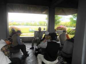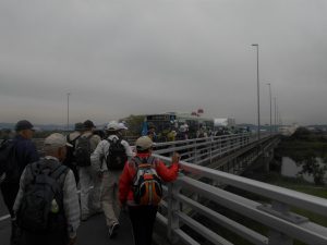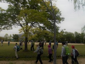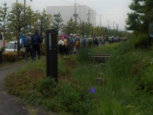 桂川駅前は、出勤の皆様に迷惑が掛かる為、上久世橋、桂川歩道橋を通り30分程度移動して河川敷の側にあるかさい公園で担当幹事から行程の説明があった。 京都水質保全環境保全センターの藤棚開園は4月末まで、今日は入れない事を説明し了解を得て、コース説明とストレッチ体操をしてスタートした。