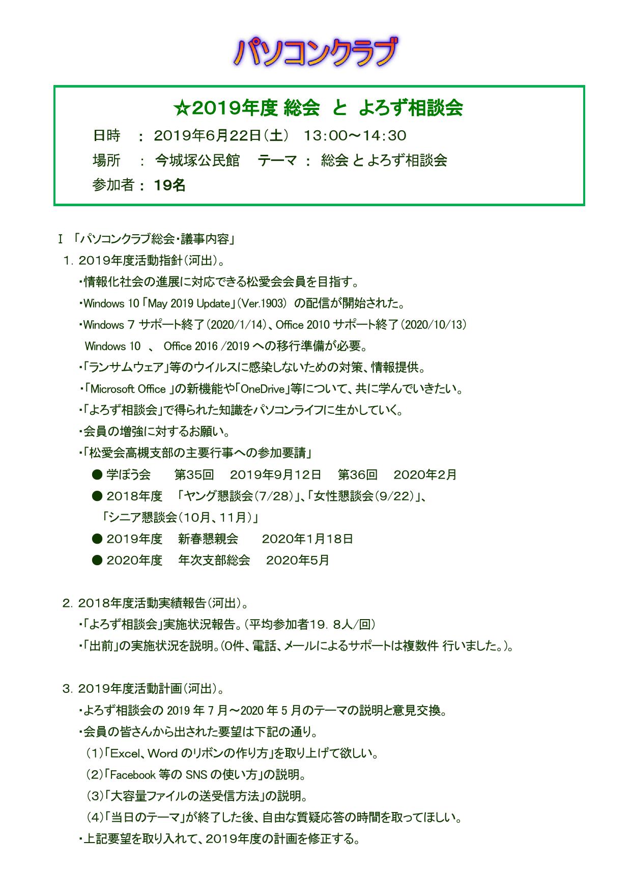 2019.06.26 パソコンクラブ, 同好会 パソコンクラブ 2019年6月度実施報告 パソコンクラブ, 同好会 コメント: 0 北摂写真クラブ 2019年6月度撮影会前の記事 北摂魚釣りクラブ 第120回例会実施報告次の記事