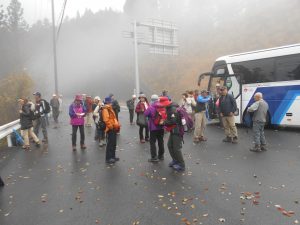 定刻前にバスが到着、乗車名簿の確認後、和歌山県高野山大門を目指して出発する。