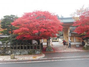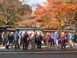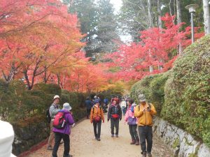 大門からの参道は、真っ赤に染まった紅葉が最高で、歩きながらカメラのシャッター音と、歓声が響き渡りました。楽しみながら刈萱堂や国宝重要文化財巡り、一の橋に到着。昼食は、一の橋観光センターにてお楽しみの、高野山名物「彩り田楽御膳」を頂きました。